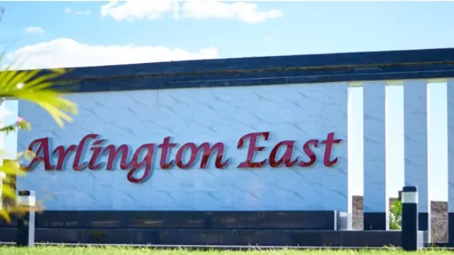 The naming signage of Arlington East, with its sophisticated marble-like background and bold red font, is not only visually appealing but also signifies the quality living experience awaiting you. This vibrant community promises comfort, security, and an inviting atmosphere for all who enter. Make Arlington East your new home today!