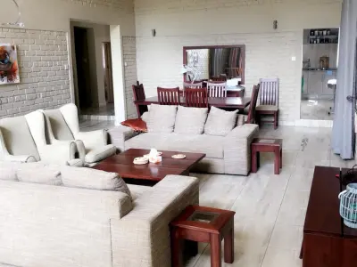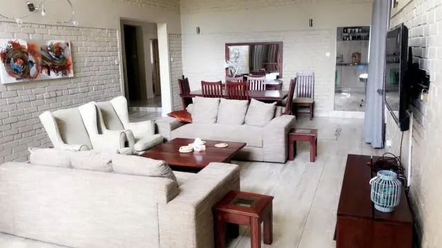 Neat modern townhouse with a Prolific Borehole, full back up power, fully furnished, 2 night guards and beautifully manicured gardens with beautiful Koi fish in the ponds.