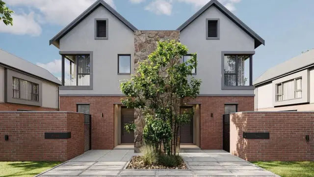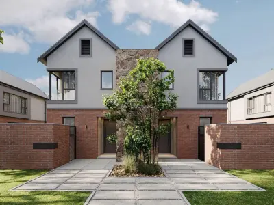 Experience modern living with a touch of tradition in the beautifully designed duplexes, showcased in the images. The structures feature an inviting blend of gray and brick accents, large windows that invite natural light, and well-defined entrances complemented by landscaped yards. One of the duplexes displays a unique combination of stone and brick, featuring gabled roofs and an airy ambiance for a welcoming feel.