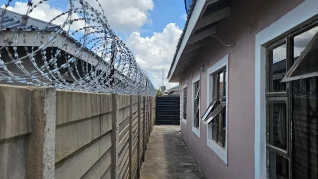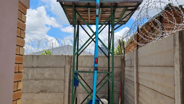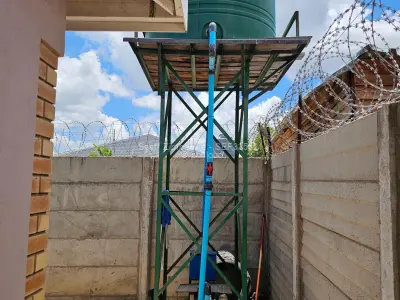 Step outside to find a well-maintained exterior, featuring a secure wall topped with barbed wire, providing peace of mind. The landscape is adorned with flowering plants, and a reliable water supply is ensured with a raised green water tank, showcasing a well-planned water management system.