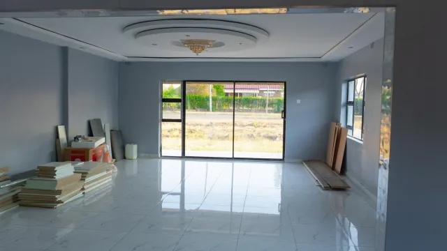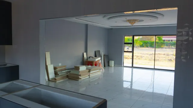The community itself showcases modern single-story homes with elegant stone faades and distinct roofs, nestled among natural greenery. Interior spaces are bright and airy, featuring high ceilings adorned with sophisticated chandeliers and glossy marble tiles.