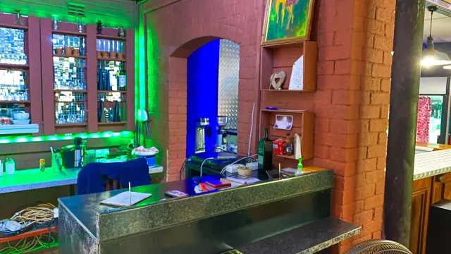 Additionally, the bar area boasts a sleek granite countertop, complete with essential service elements and thoughtfully arranged shelving for glassware. Green accent lighting adds a touch of vibrancy to the aesthetic, creating an inspiring environment for both staff and patrons.