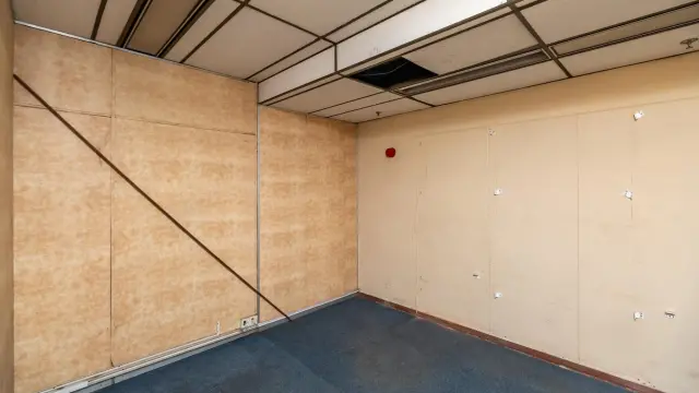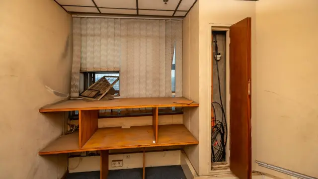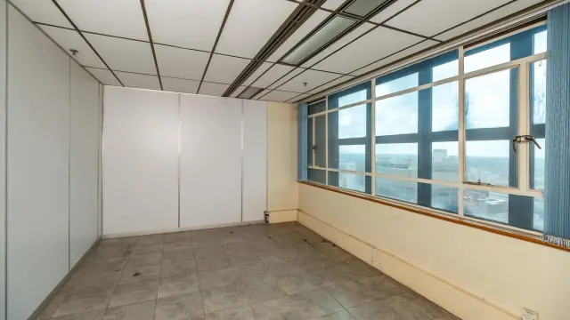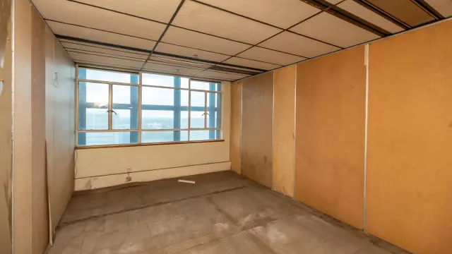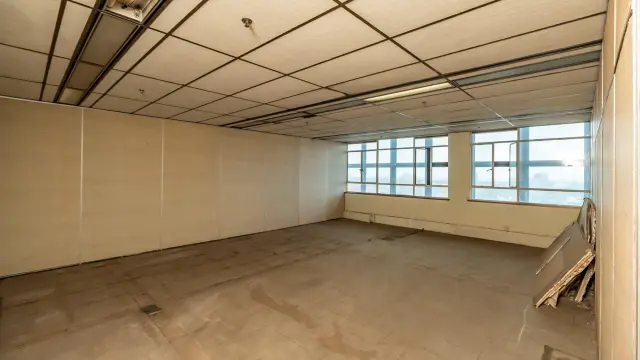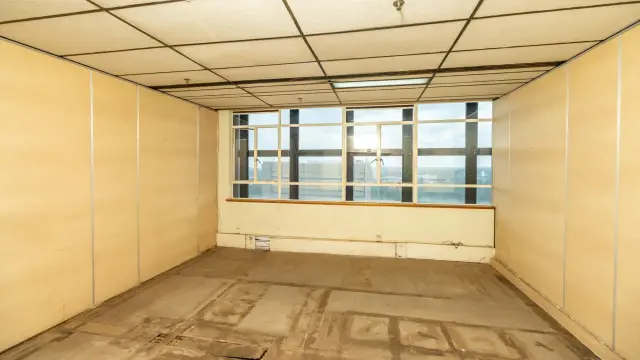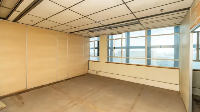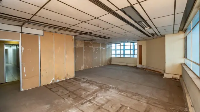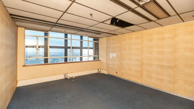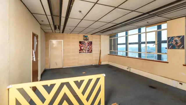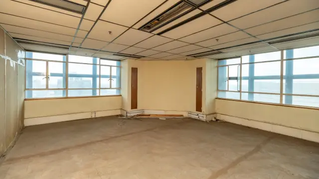 Among the various rooms, an empty office space boasts large windows that frame stunning city views, while another spacious area is enhanced by lively artwork and natural light filtering through windowpanes on two sides. Additionally, many areas may benefit from refurbishment, allowing you to add your personal touch.