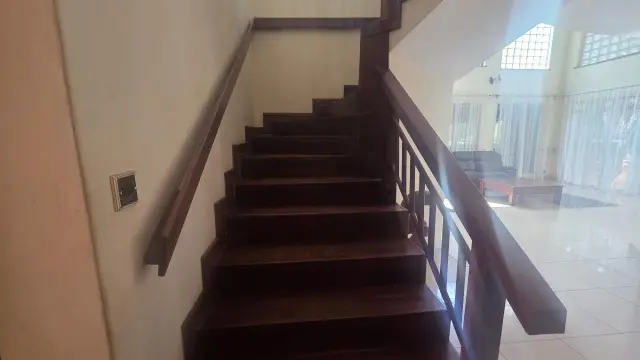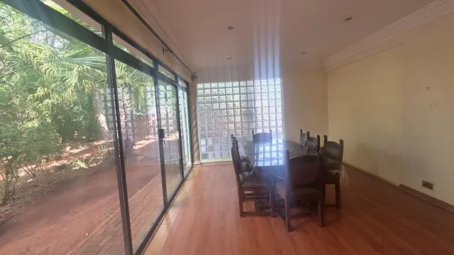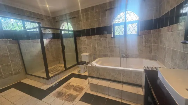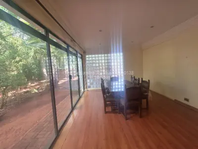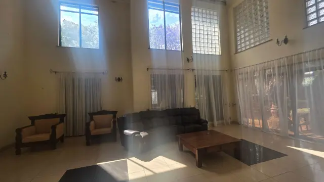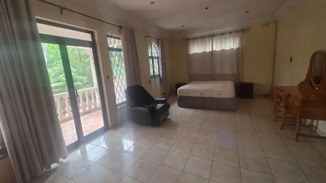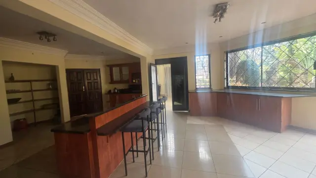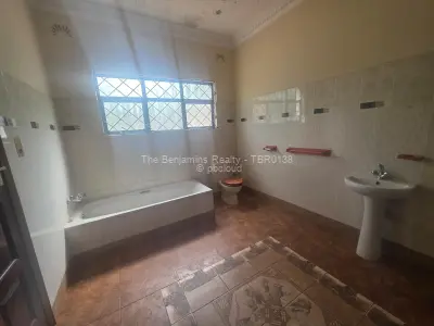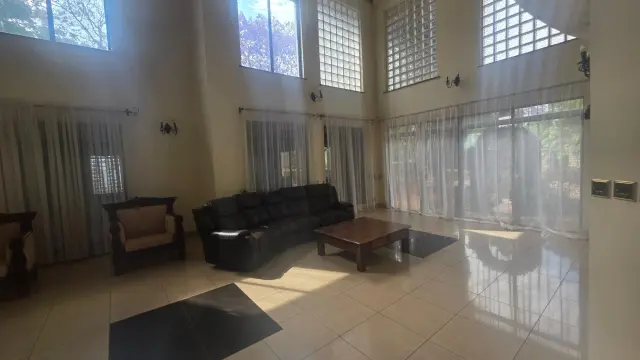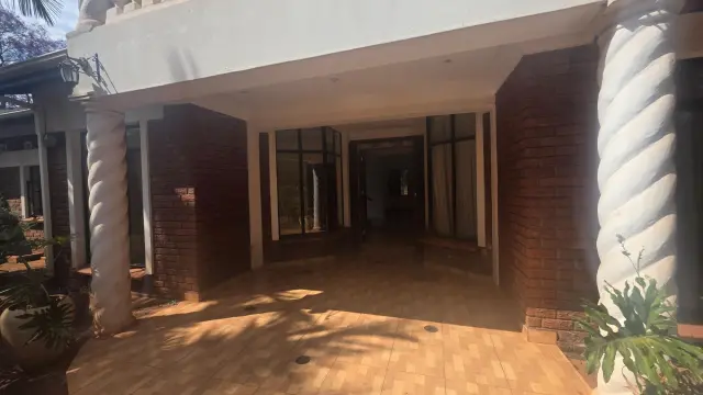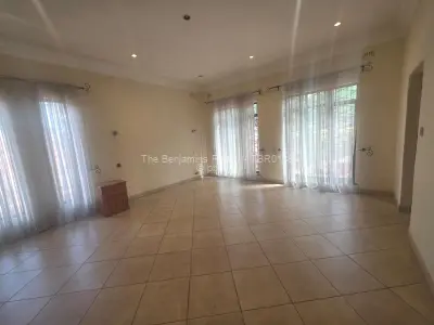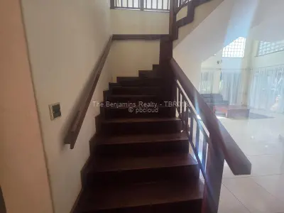 Great position - home in Borrowdale. Just passed the Sam Levy Village. Four bedroom home with three bathrooms. DOWNSTAIRS - Two lounges, a playroom , dining room and kitchen, pantry with French doors opening up to braai area and garden. Two bedrooms with shared bathroom. Study, Laundry. UPSTAIRS Pyjama lounge leading onto undercover veranda. Two bedrooms en-suite. Main bedroom is large with doors opening onto balcony. . Municipal water, back up water tanks. Ample parking. Slam lock doors, walled, electric gate, house alarm. Solar system.