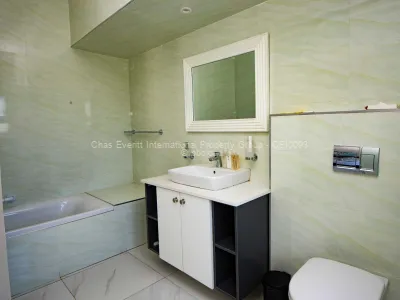 The well-appointed fitted kitchen comes complete with a gas stove and ample cabinetry, making meal prep a pleasure. Experience luxury with three bathrooms, including a main en-suite, and enjoy the convenience of built-in cupboards throughout. For fitness enthusiasts, an on-site gym is available.