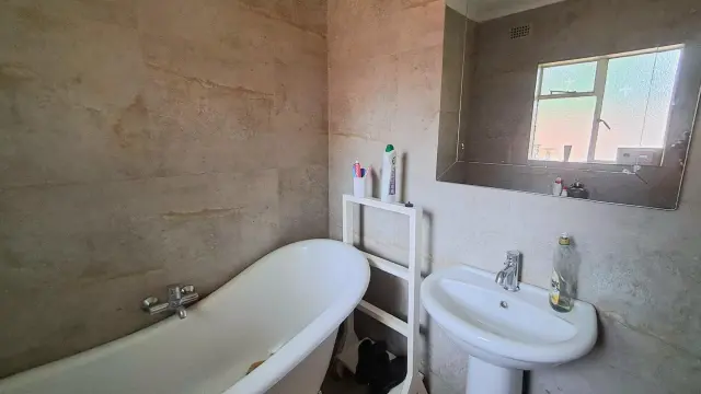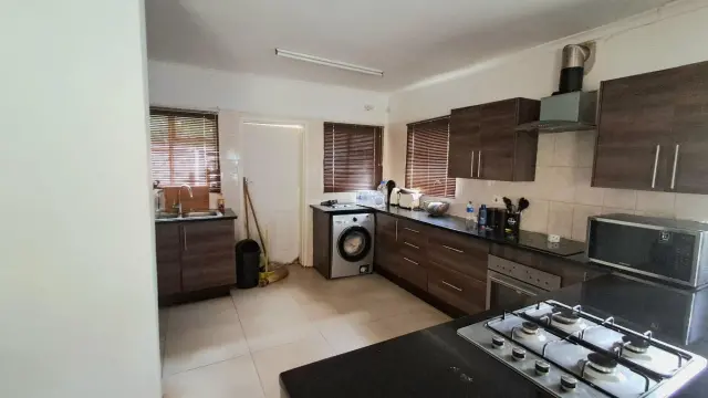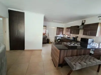 The property has an open plan kitchen with a fitted gas stove, scullery as well as ample cupboard space. The dining area is spacious and can fit a dining room set, the lounge is spacious and opens up to a lush garden.