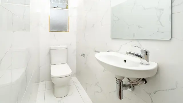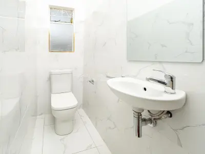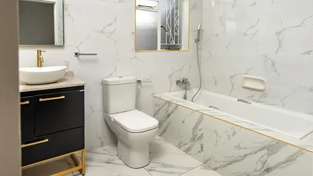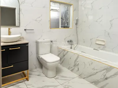 -Executive bathroom with classic marble tiling, gold finishes, smart fittings, hand basin, and toilet