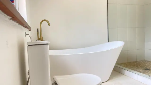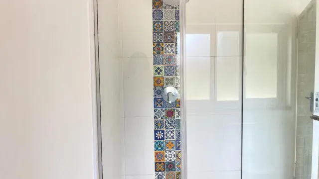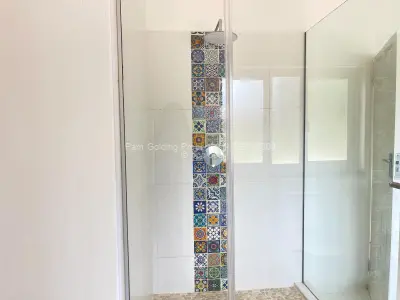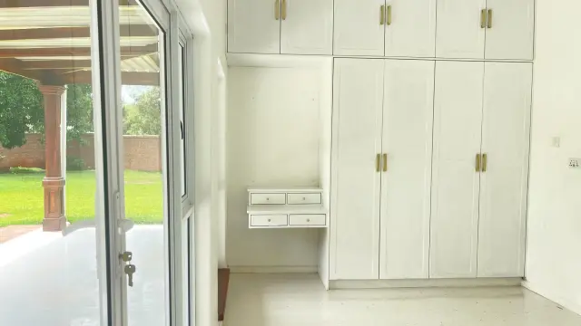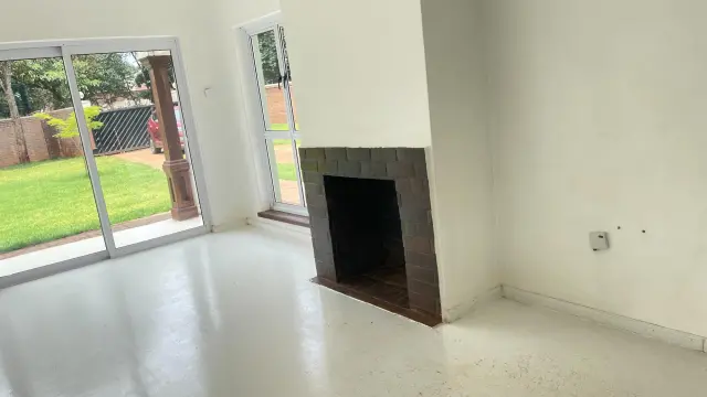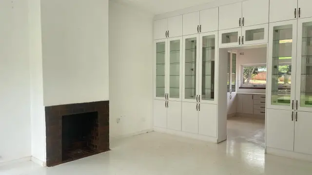 The property features a fitted kitchen with space for a stand alone gas or electric stove, an extractor fan, space for a double door fridge and flip-out windows for natural ventilation. The kitchen also has a pantry for ample storage. The lounge is cozy, with a fireplace and double doors that open out into the garden. A solar geyser ensures a reliable supply of hot water.