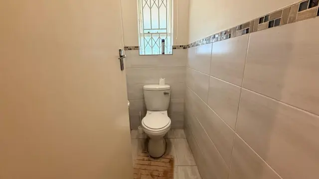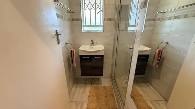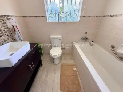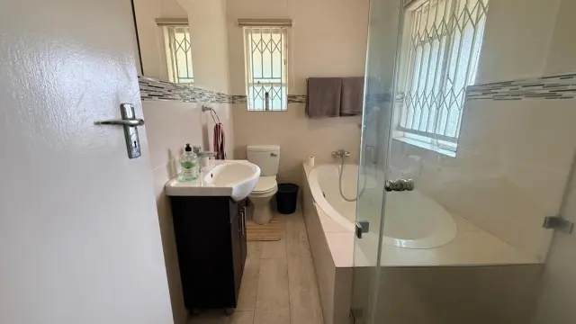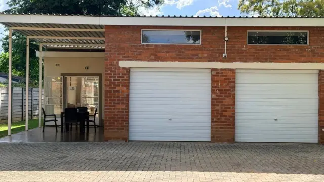 The main house features a spacious master bedroom with doors opening onto the garden, complemented by an ensuite bathroom with both a bath and shower. Two additional bedrooms, all with built-in cupboards. Two bathrooms, one with a shower, the other with a bath and a separate toilet.