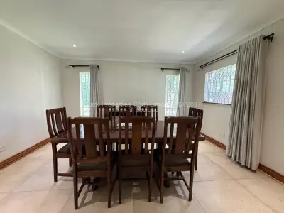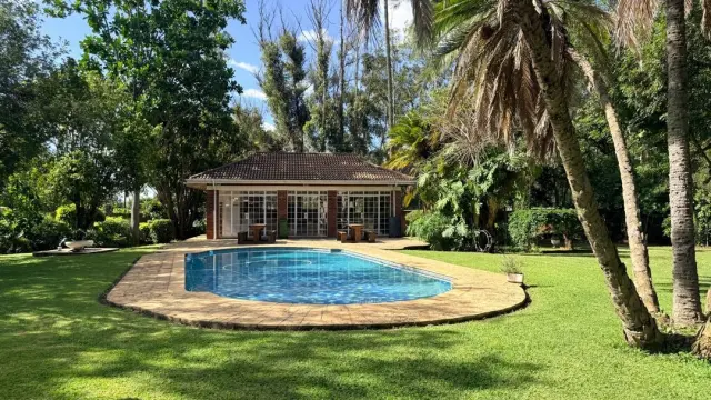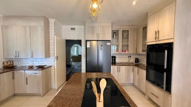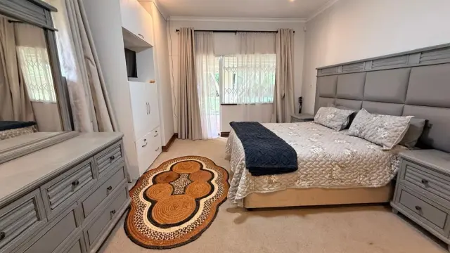 Outdoor living is equally impressive, with a swimming pool, a dedicated pool house, and a large manicured garden that creates a serene backdrop. Practical amenities include a borehole, solar system, laundry room, double lock-up garage, and an electric gate.