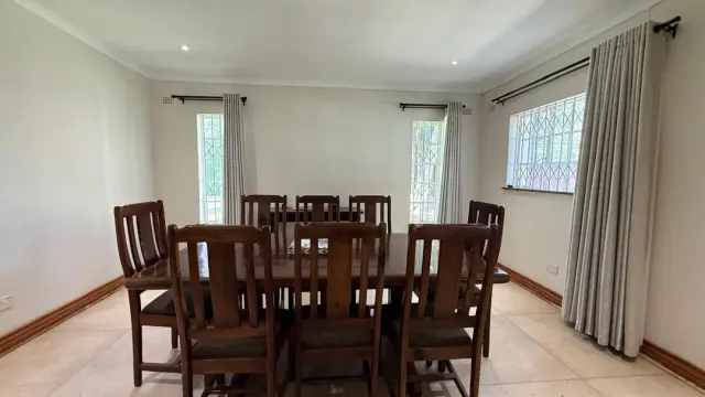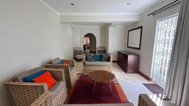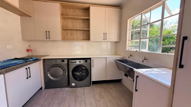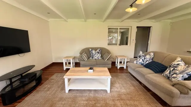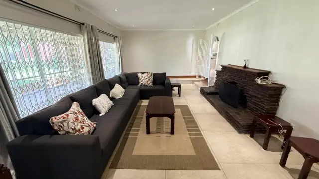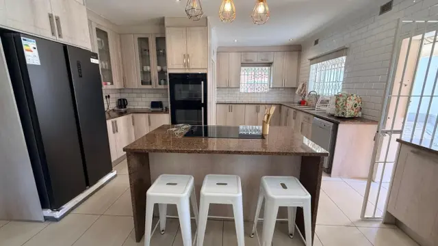 This charming property offers warm and inviting living spaces, featuring two loungesone centered around a fireplace, a dining area, and a well-appointed kitchen with ample cupboard space.