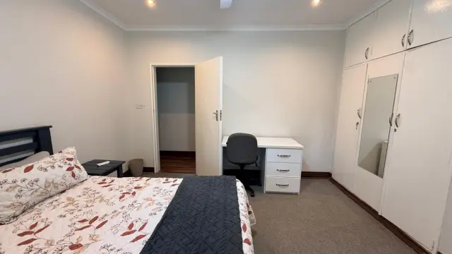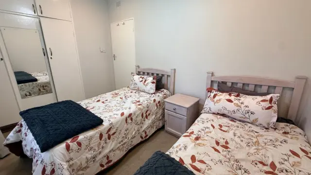 The property extends its charm with a modern, self-contained cottage comprising an open-plan lounge, dining area, and kitchen fitted with a four-plate stove (two gas and two electric plates, plus an oven). It includes two bedrooms with built-in cupboards, a bathroom with a shower, and a small verandah.