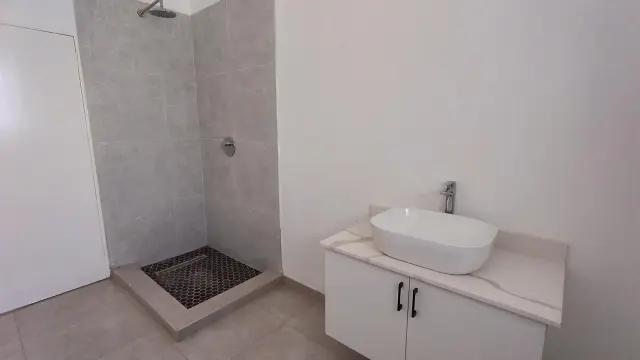 The living area is minimalist, providing a calm atmosphere while maintaining connectivity to the rest of the home. Additional features include built-in cupboards, a master ensuite bathroom, and a small garden complete with security lighting.