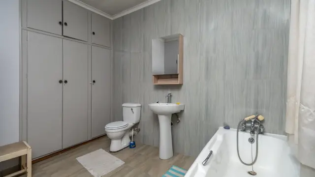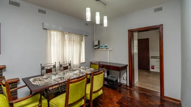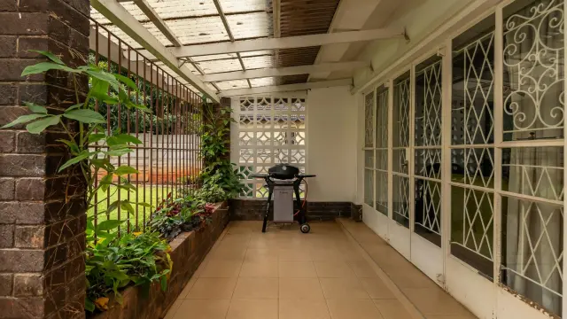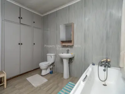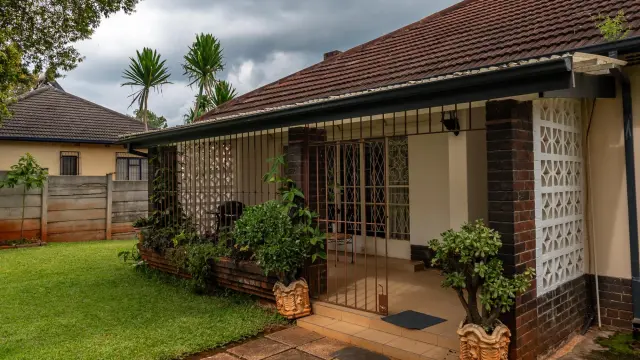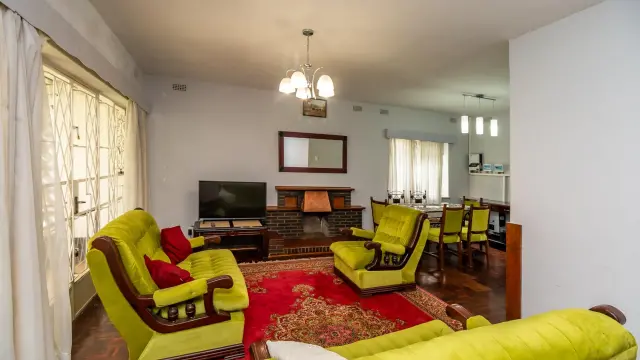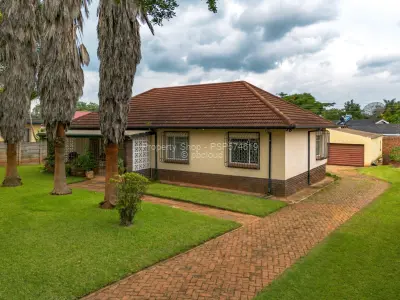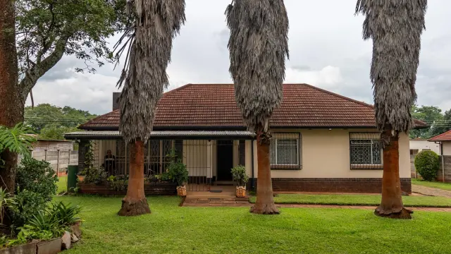 This lovely family home in Hillside, Harare, is the perfect balance of comfort and style. The house features a classic design with a pitched red-tiled roof and a harmonious blend of cream-colored walls and brick accents. Lush landscaping surrounds the property, with a green lawn and tall palm trees creating a tropical feel.