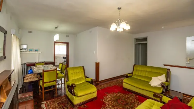 Step inside to find a spacious living area adorned with plush green sofas, perfect for relaxation. The polished wooden floors enhance the warm ambiance, while modern light fixtures provide a contemporary touch. Adjacent to the living room, the dining area, defined by a vibrant red rug, is ideal for family gatherings.