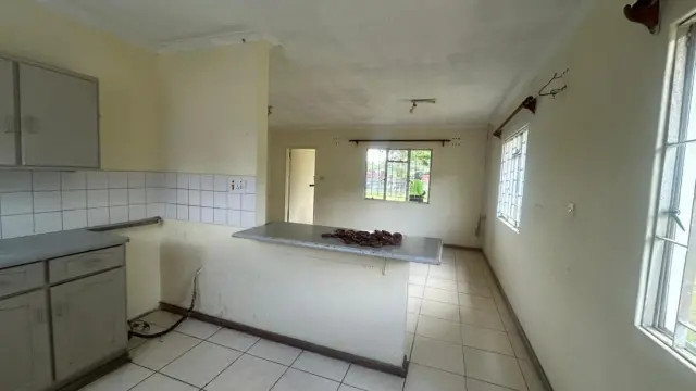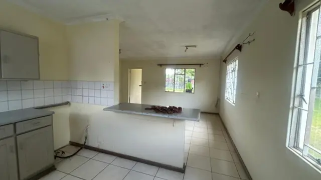 Inside youll find bright, tiled floors throughout and an open-plan kitchen and living area with a handy breakfast bar ideal for casual dining or entertaining. The kitchen offers built-in cupboards and counter space ready for your appliances. Both bedrooms are well-proportioned with natural light and one fitted wardrobe visible, while the family bathroom includes a shower and basic fittings. Security window grilles and a solid perimeter wall add peace of mind.