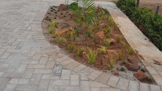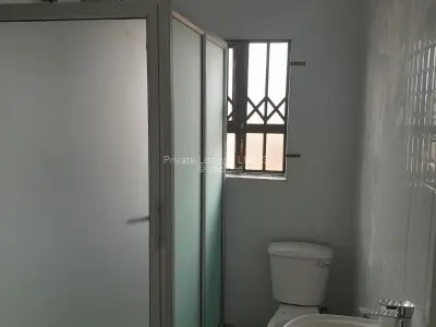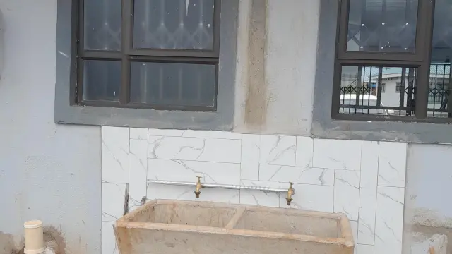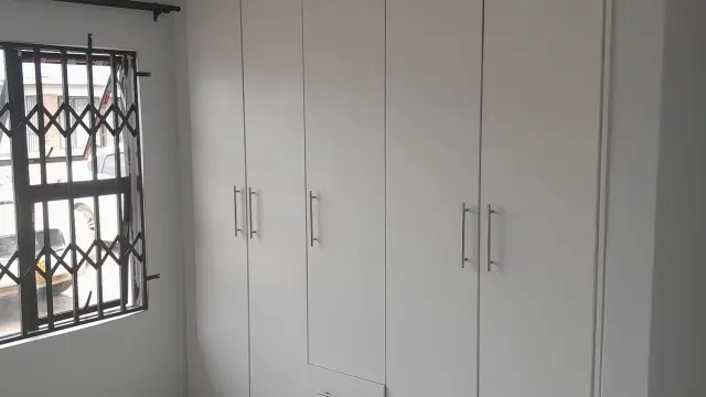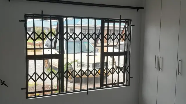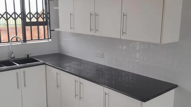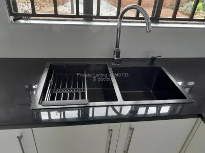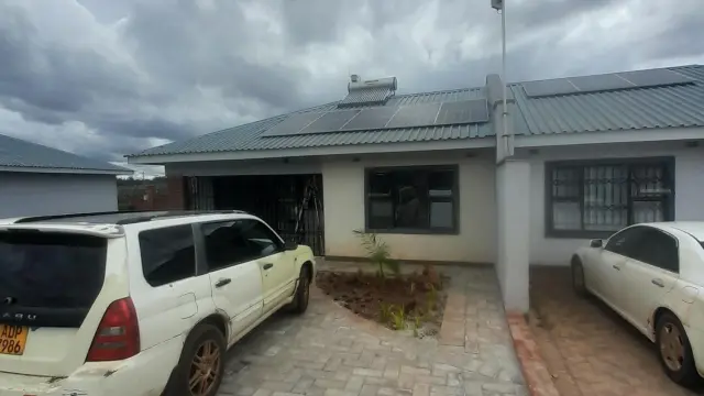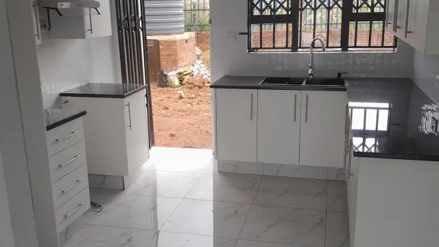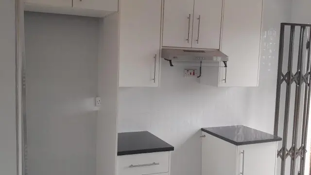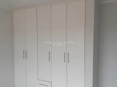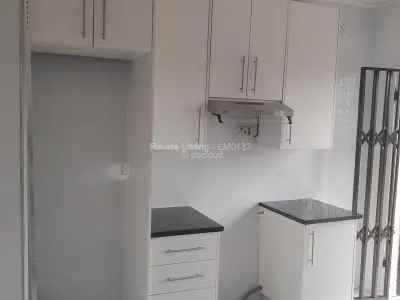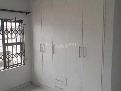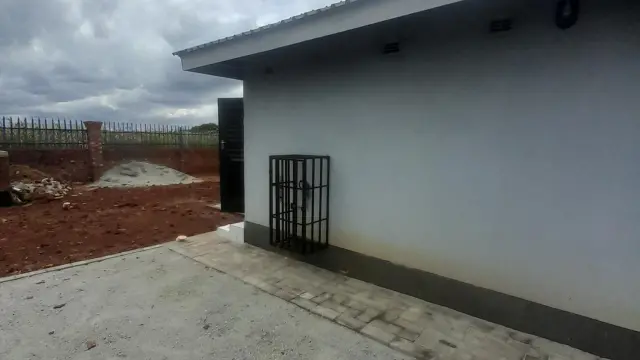 This inviting garden flat in Tynwald South at Sunset Villas Harare, presents a modern yet minimalist lifestyle. The exterior boasts a stylish faade, combining painted walls with brick columns for added character and security. A covered parking space complements the flat's practical design.
