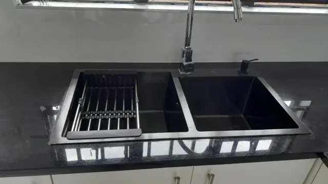 Upon entering, youll find a spacious living area that leads into a fitted kitchen, featuring sleek cabinetry and elegant dark countertops that contrast beautifully with the bright tiles. Ample natural light pours in, creating a warm and welcoming atmosphere.