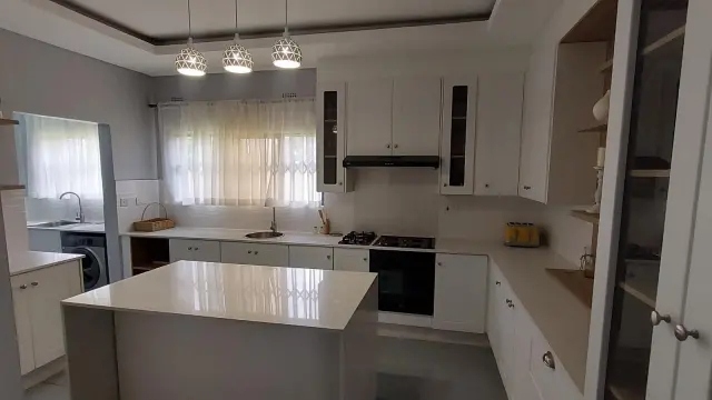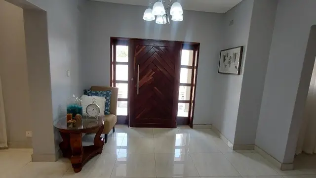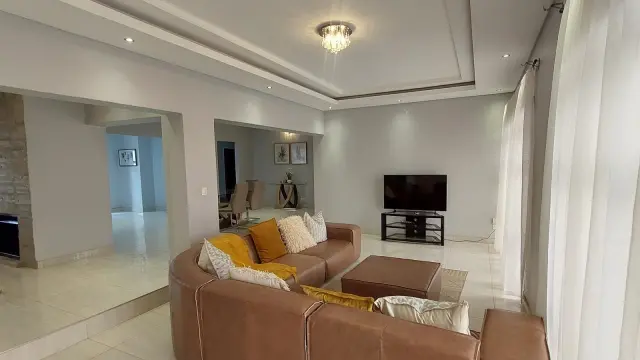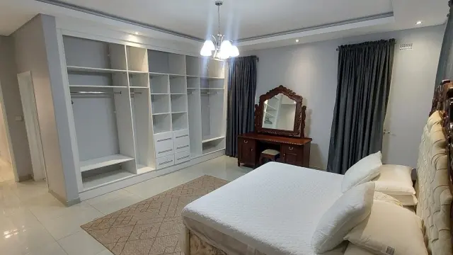 Outdoors, a neatly landscaped garden complements the inviting veranda, while security lighting and an electric gate ensure peace of mind. Additional features include two lounges for relaxation, a dedicated entertainment area, and staff quarters.