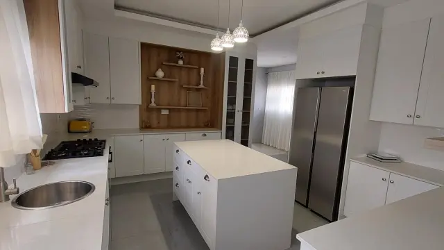 Adjacent to the living area, the dining room is perfect for gatherings, boasting a chic glass dining table surrounded by modern chairs. The fitted kitchen is equipped with a gas stove, making cooking delightful.